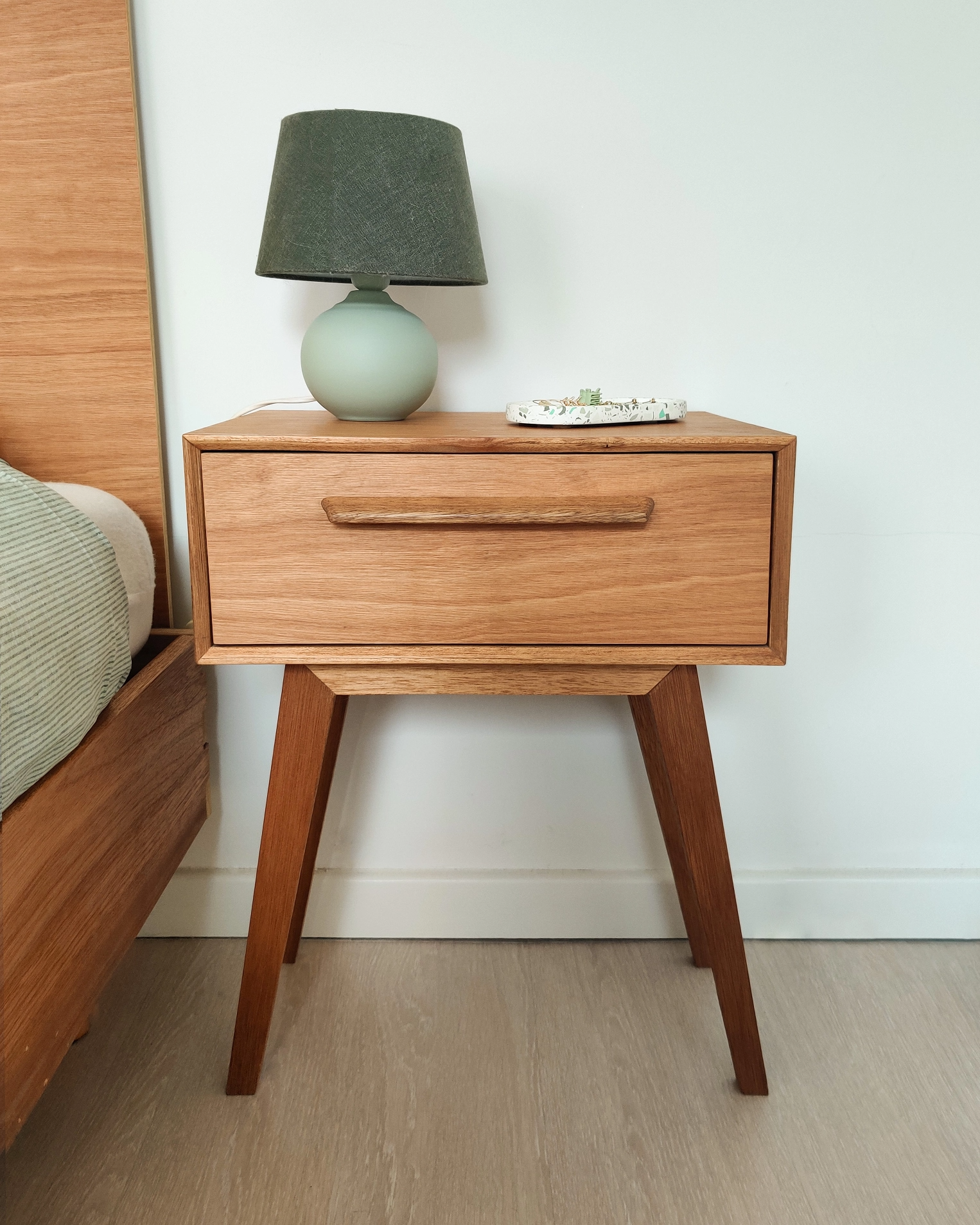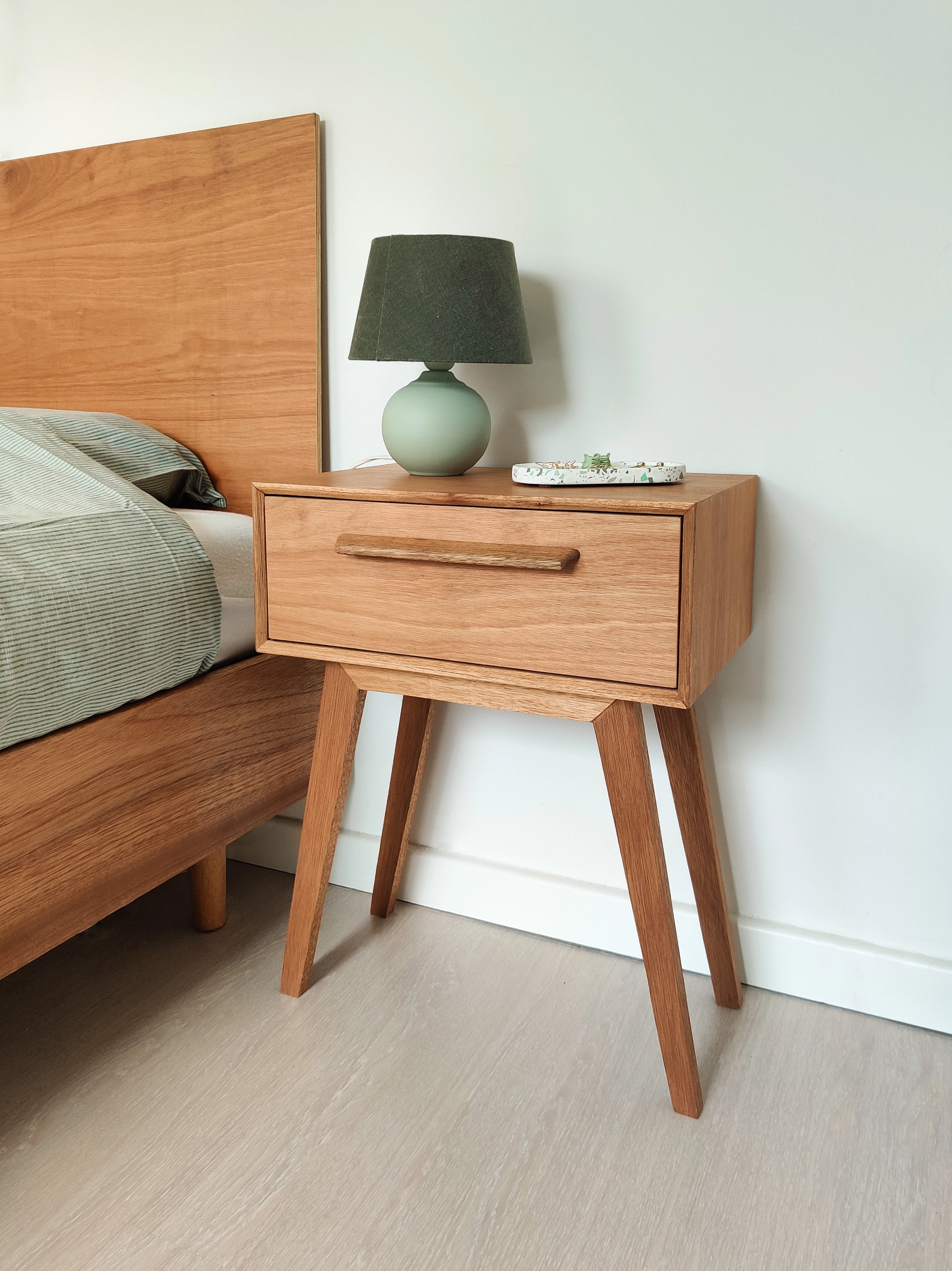 A pair of meticulously crafted nightstands that seamlessly blend functionality with midcentury modern charm. These unique pieces, born from a passion for woodworking, embody a timeless design that adds both character and practicality to your bedroom. Handcrafted with precision and attention to detail. These were my first pieces for sale after I made the first two for myself.